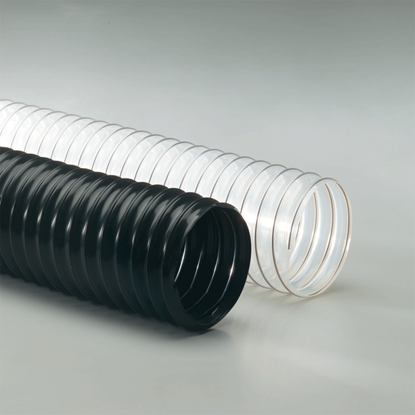Light weight clear or black polyurethane hose reinforced with a bronze coated spring steel wire helix.