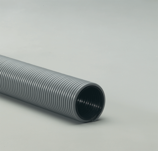 Tuyau en copolymère de polyéthylène gris renforcé par une hélice en polyéthylène intégrée.