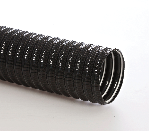 Tuyau en polyuréthane élastomère noir renforcé d'une hélice en fil d'acier à ressort revêtu de vinyle.