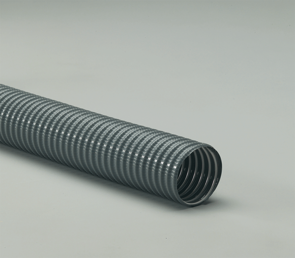 Tuyau en PVC gris renforcé d'une hélice en fil d'acier à ressort revêtu de vinyle.